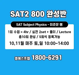 κ²¨μšΈλ°©ν•™ AP, SAT Physics μˆ˜μ—…μ•ˆλ‚΄ [ AP Physics 1 ] [ AP Physics 2 ][ AP Physics C Mechanics ] [ AP Physics C Electricity & Magnetism ][ SAT Physics Concepts ] AP Physics 1 β–Ά GPA λŒ€λΉ„, 3hr × 6회 μˆ˜μ—… β–Ά Cover : Rotational Motion, Gravity, Simple Harmonic Motion, Simple Circuit, Wave β–Ά μˆ˜μ—… 일정 : μ•„λž˜ AP Physics1 A λ˜λŠ” B 선택 μˆ˜κ°• λ“±λ‘λ¬Έμ˜ μ— μ—μŠ€ν”„λ ™ 1800-6291 [ AP Physics 1 ] [ AP Physics 2 ][ AP Physics C Mechanics ] [ AP Physics C Electricity & Magneti.. 더보기