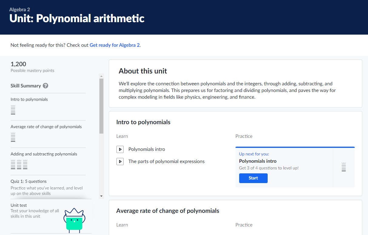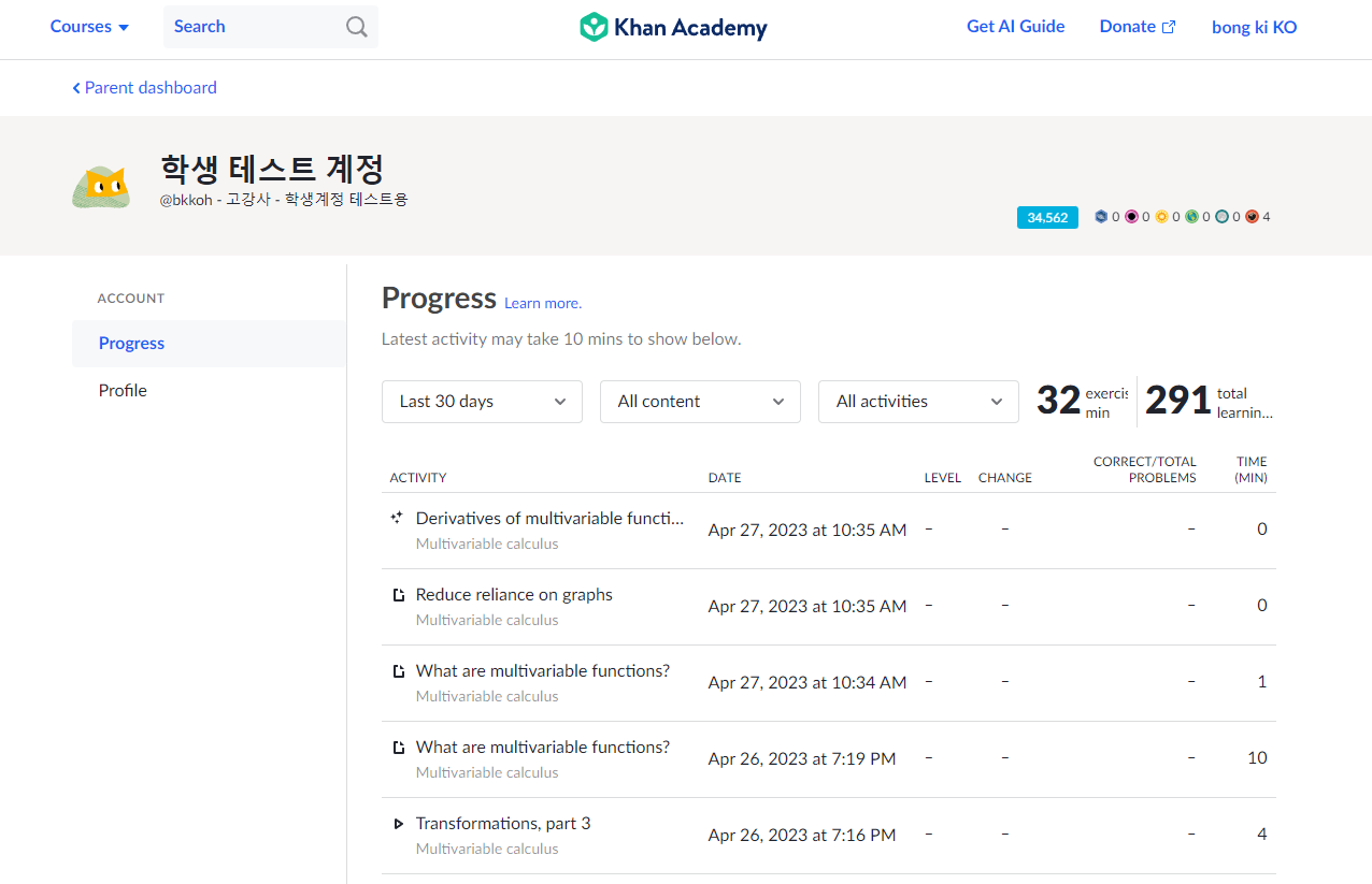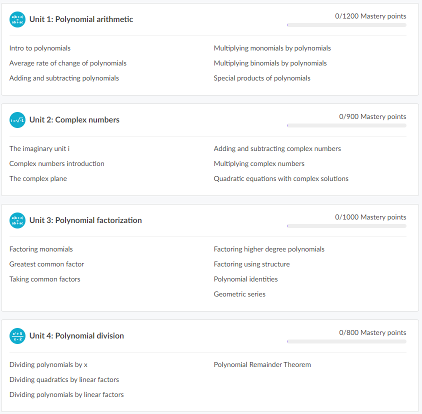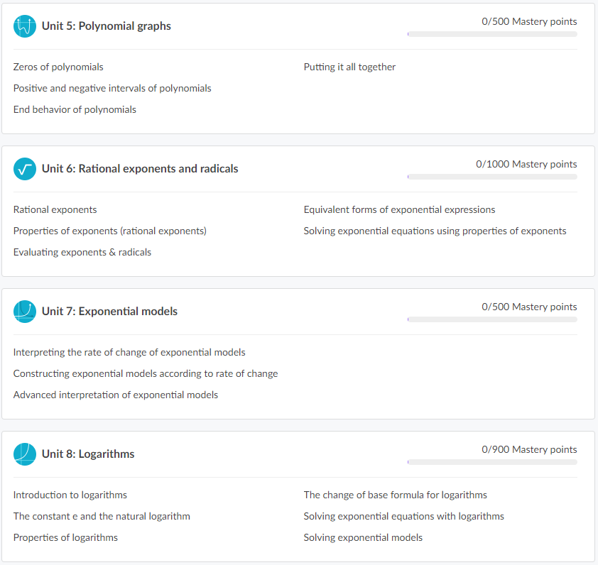 ์นธ ์์นด๋ฐ๋ฏธ Algebra 2 ๋ฅผ ๊ณต๋ถํ๋ ํ์์ ์ค์ค๋ก ๊ณต๋ถํ๋ฉด์ ์ ์ฒด ํ์ต ์ง๋, ๊ฐ Unit ๋ณ ํ์ต ์งํ ์ฌํญ์ ํ ๋์ ํ์ธํ ์ ์์ต๋๋ค.