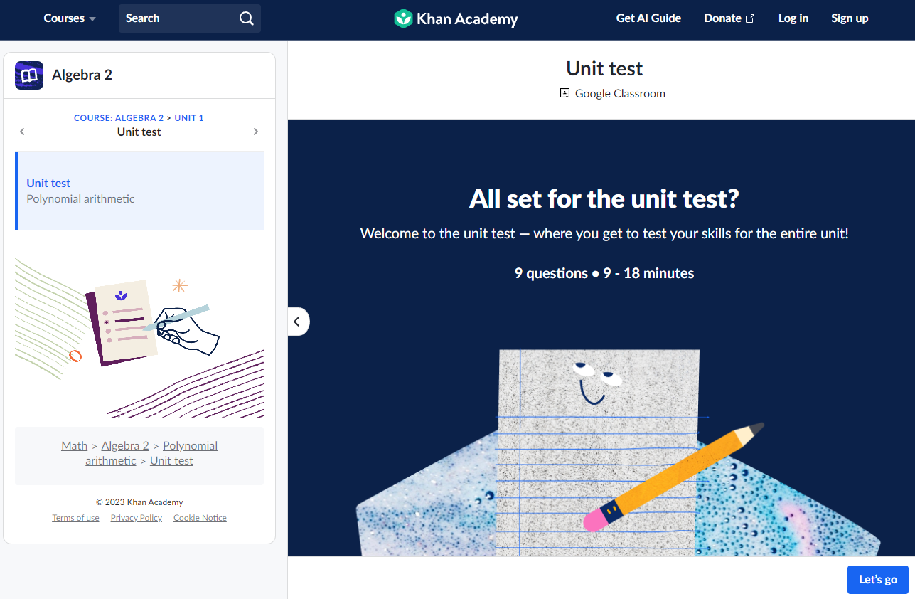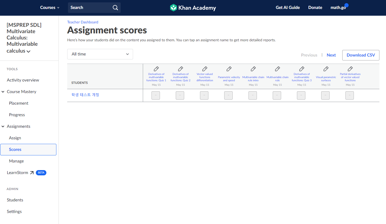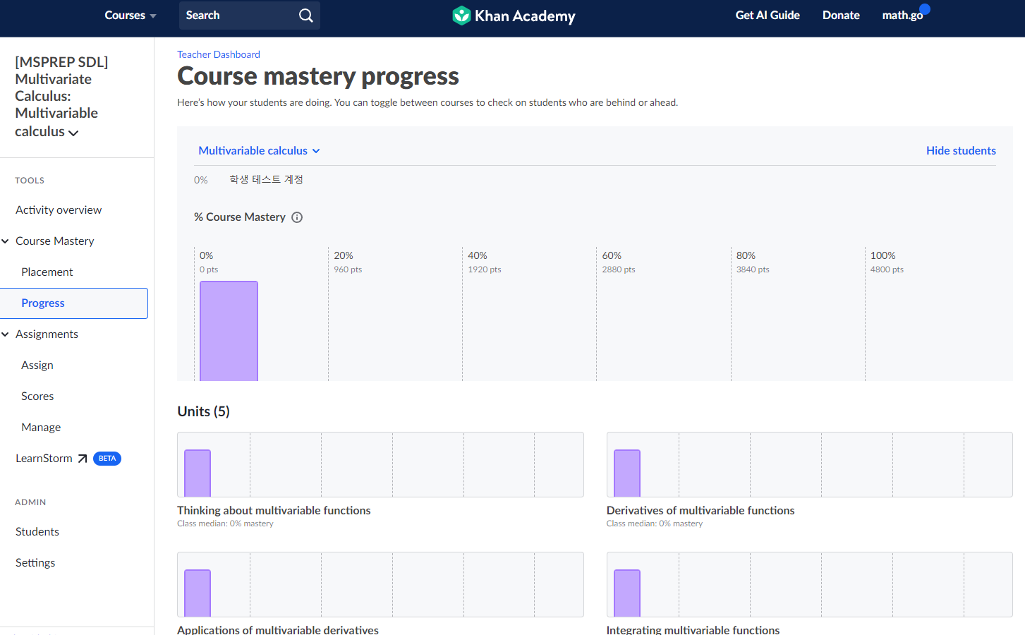 ์นธ ์์นด๋ฐ๋ฏธ Algebra 2 ๋ฅผ ๊ณต๋ถํ๋ ํ์์ ์ค์ค๋ก ๊ณต๋ถํ๋ฉด์ ์ ์ฒด ํ์ต ์ง๋, ๊ฐ Unit ๋ณ ํ์ต ์งํ ์ฌํญ์ ํ ๋์ ํ์ธํ ์ ์์ต๋๋ค.