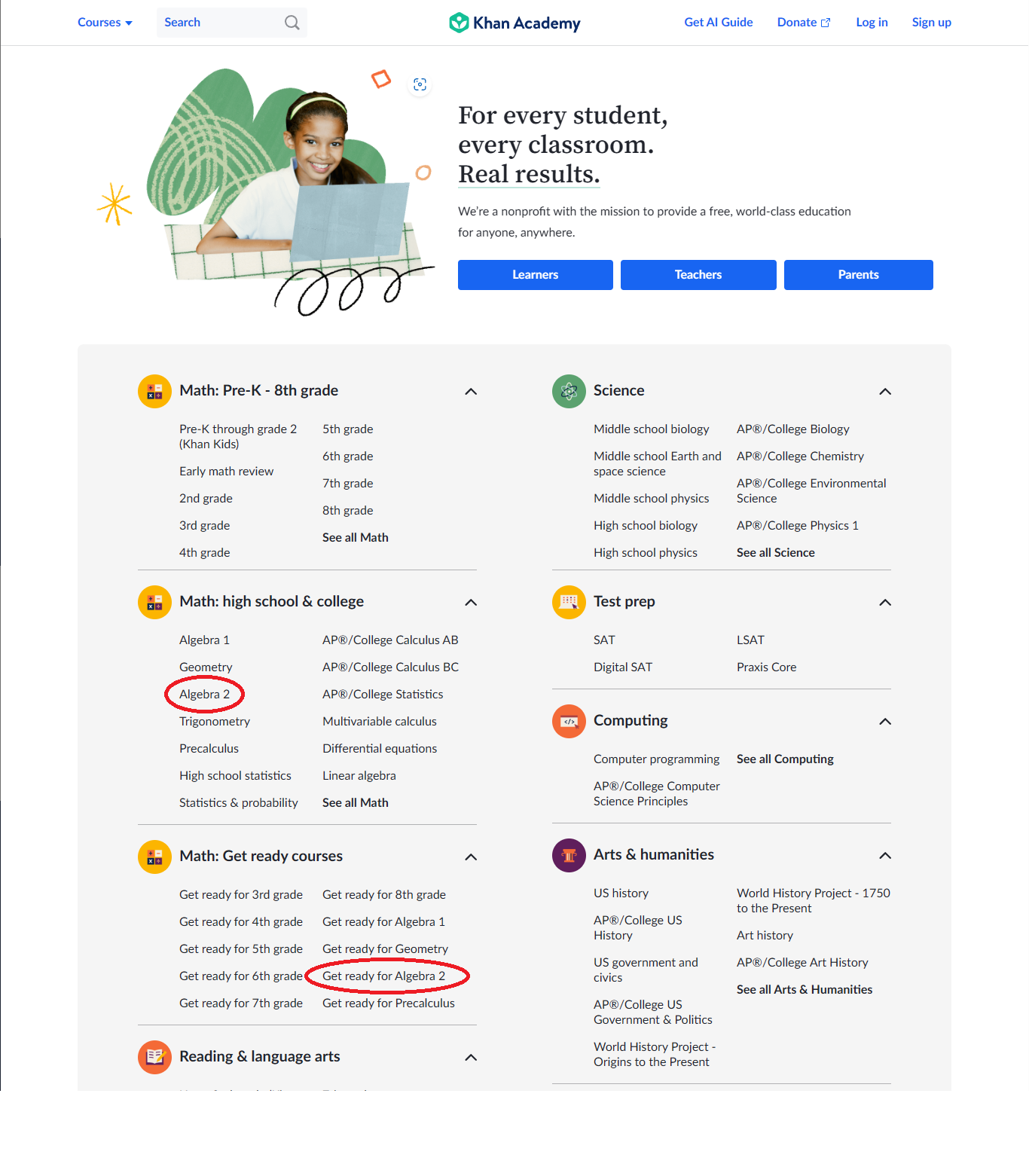 ํน์ ์นธ ์์นด๋ฐ๋ฏธ ์ฌ์ดํธ์ ๋ด์ฉ์ด ํ๊ธ๋ก ๋์์ Algebra2๋ฅผ ์ฐพ๊ธฐ ์ด๋ ค์ฐ๋ฉด, ํ๋ฉด์ ์๋๋ก ๋ด๋ ค์ ๊ตญ๊ฐ๋ฅผ "๋ฏธ๊ตญ"์ผ๋ก ์ ํํ๋ฉด ์๋ฌธ์ผ๋ก ๋ฏธ๊ตญ ๊ต๊ณผ๊ณผ์ ์ด ํ๋ฉด์ ํ์๋ฉ๋๋ค.