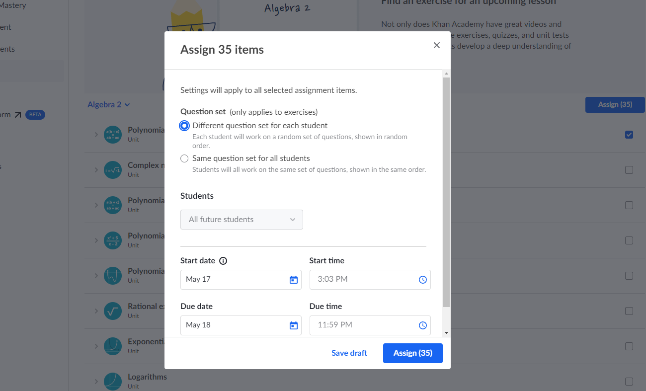 ์๋ ์ ํ์ต ์ง๋์ ์ํฉ์ ์์ธํ๊ฒ ํ์ธํ๊ณ ๊ด๋ฆฌํ๊ณ ์ ํ๋ค๋ฉด, ๋จ์ํ ๋ถ๋ชจ-์๋ ๊ณ์ ์ ์ฐ๊ฒฐํ๋ ๊ฒ ๋ณด๋ค๋ ๋ถ๋ชจ๋ ๊ณ์ ์์ Teachers Dashboard์์ Algebra 2 Class๋ฅผ ๋ง๋ค๊ณ ์์ด๋ฅผ ํ์์ผ๋ก ์ถ๊ฐํ๋ฉด ๋ฉ๋๋ค. ๊ทธ๋ฌ๋ฉด ๊ฐ Unit ๋ณ๋ก ํ์ต ์ํฉ์ ์์ธํ๊ฒ ์ดํ ์ ์๊ณ , ํ์ต ์ง๋์ Quiz, Test๋ฅผ ๊ธฐํ์ ์ค์ ํ๊ณ ๊ณต๋ถ์ํฌ ์ ์์ต๋๋ค. ํ๋ง๋๋ก ์์ด์ ๊ณต๋ถ ์ค์ผ์ฅด์ ์ ํ ์ ์๊ณ , ์ ๋๋ก ๋ฐ๋ฅด๊ณ ์๋์ง ํ์ธ์ด ๊ฐ๋ฅํฉ๋๋ค.