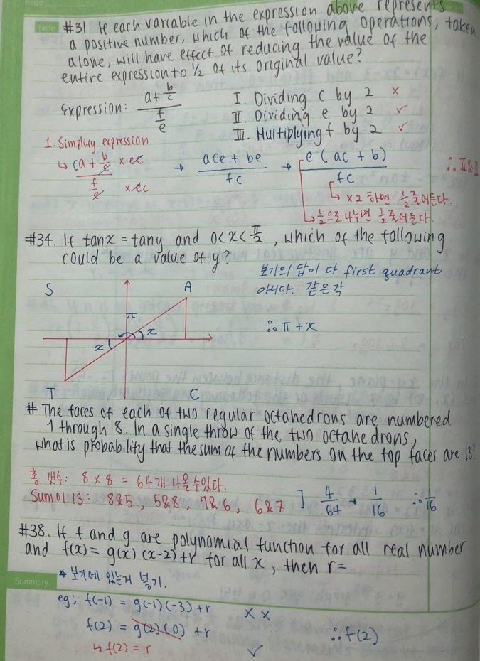 μ΄ νμμ 8μμ μ§νλ μ΄ 10μΌκ°μ SAT Math2c Final μμ μ ν΅ν΄ λͺ¨λ 30μΈνΈμ μ€μ λλΉ ν μ€νΈλ₯Ό νμμ΅λλ€. 10μΌ λμ λͺ¨λ 50λ¬Έμ ×30μΈνΈ=1500λ¬Έμ λ₯Ό νμλλ°μ, λ§€ ν μ€νΈλ§λ€ κΎΈμ€νκ² μ€λ΅μ μ 리νκ³ νμμμ ν루 6μκ° μ΄μ(ν μ€νΈμκ° ν¬ν¨) 10μΌκ° μ λ§ μν μ€λΉμ μ¬μΈνμ΅λλ€.