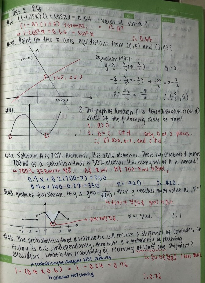 μ΄ νμμ 8μμ μ§νλ μ΄ 10μΌκ°μ SAT Math2c Final μμ μ ν΅ν΄ λͺ¨λ 30μΈνΈμ μ€μ λλΉ ν μ€νΈλ₯Ό νμμ΅λλ€. 10μΌ λμ λͺ¨λ 50λ¬Έμ ×30μΈνΈ=1500λ¬Έμ λ₯Ό νμλλ°μ, λ§€ ν μ€νΈλ§λ€ κΎΈμ€νκ² μ€λ΅μ μ 리νκ³ νμμμ ν루 6μκ° μ΄μ(ν μ€νΈμκ° ν¬ν¨) 10μΌκ° μ λ§ μν μ€λΉμ μ¬μΈνμ΅λλ€.
